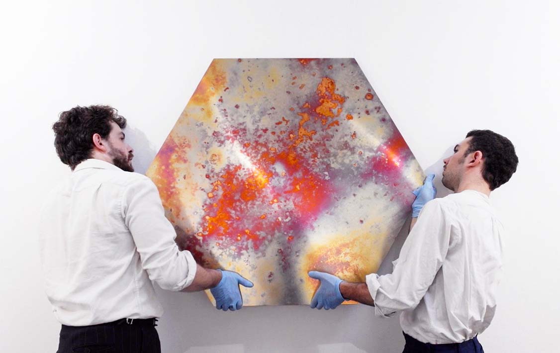 I primarily work with a charcoal concentrate to obtain a deep black colour that evokes infinite space. I’ve also always used red and blue, which stand for extreme temperatures.